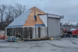 A split image showing a roof renovation process. On the left, a wooden frame with plywood sheets laid out, indicating the 'Before' stage. On the right, a finished roof covered with gray shingles, labeled 'After'.